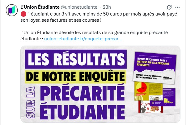 L’enquête souligne également l’impact négatif de la fin du repas à 1€ pour toutes et tous en 2023. L’Union étudiante déplore que ce tarif soit désormais conditionné à une justification de précarité « souvent stigmatisante ».