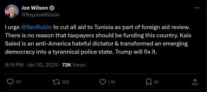 Le représentant du 2e district congressionnel de la Caroline du Sud à la chambre des représentants des États-Unis, Joe Wilson, a exhorté le secrétaire d’État Marco Rubio à supprimer toute aide à la Tunisie dans le cadre de la révision de l’aide étrangère.