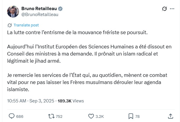 « La lutte contre l’entrisme de la mouvance frériste se poursuit », a écrit le ministre de l’Intérieur, accusant l’institut de légitimer « le jihad armé ».