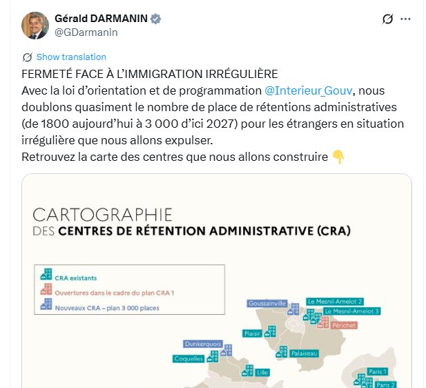 « Avec la loi de programmation du ministère de l’Intérieur, nous doublons quasiment le nombre de places de rétention administrative (de 1 800 aujourd’hui à 3 000 d’ici 2027) pour les étrangers en situation irrégulière que nous allons expulser (Communiqué officiel du ministère de l’Intérieur.»