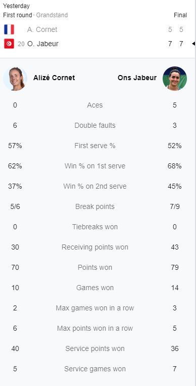 Connue désormais pour ses amorties, « les meilleures du circuit » de l’aveu du numéro 3 mondial Tsitsipas, la tunisienne qui n’avait jamais été battue lors de ses deux précédentes rencontres avec Cornet est une fois n’est pas coutume restée concentrée et sereine lors des points le plus déterminants. Au service, elle aligne également 5 aces contre 0 pour Cornet.